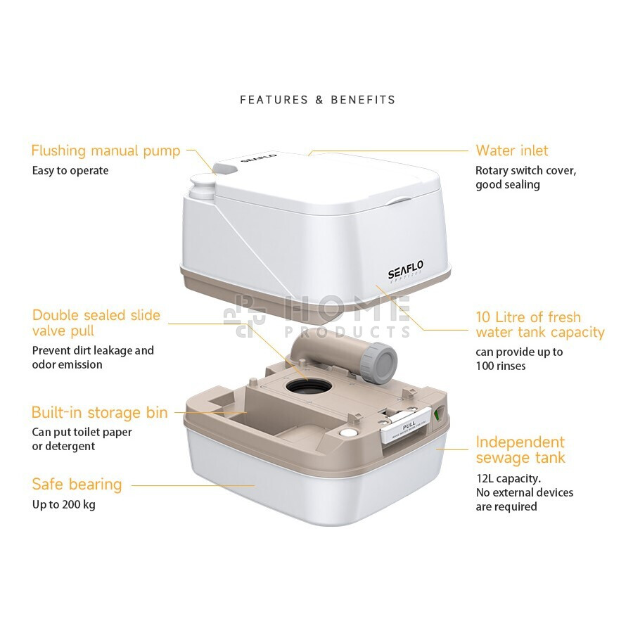 De verbeterde T-vormige spoelmethode, 360° wervelstroomspoeling maakt het toilet schoner en hygiënischer. SEAFLO draagbaar toilet is geschikt voor mobiel gebruik, zoals op de camping, boot, caravan, hut, medisch, kinderen, familie, noodgevallen, enz.