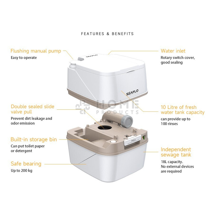 De verbeterde T-vormige spoelmethode, 360° wervelstroomspoeling maakt het toilet schoner en hygiënischer. SEAFLO draagbaar toilet is geschikt voor mobiel gebruik, zoals op de camping, boot, caravan, hut, medisch, kinderen, familie, noodgevallen, enz.